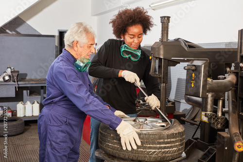 Ausbilder in der Auto Werkstatt mit Frau als Lehrling
