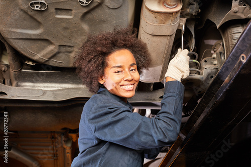 Afrikanische KFZ Mechanikerin bei Auto Reparatur