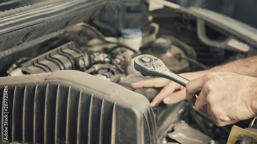 Mechatroniker mit Werkzeug in KFZ Werkstatt