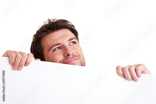 Mann schaut über leeres Plakat