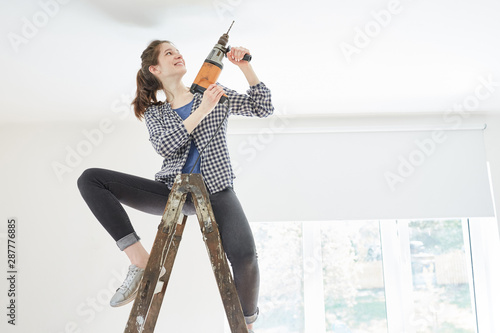 Woman as a handyman with drill on ladder