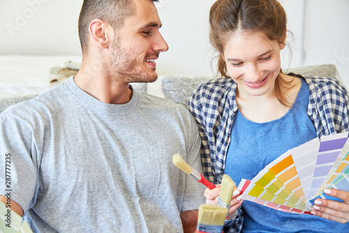 Paar als Heimwerker mit Pinsel und Farbfächer