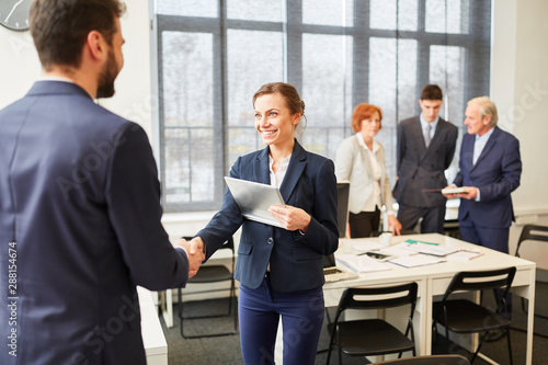 Business Frau begrüßt einen Geschäftspartner