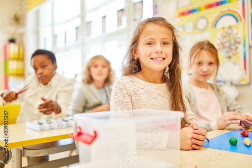 Mädchen in Schule steht vor Tafel mit Muskeln