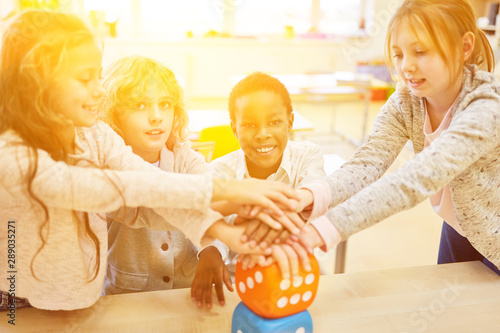 Gruppe Kinder stapelt Hände als Teamwork Konzept