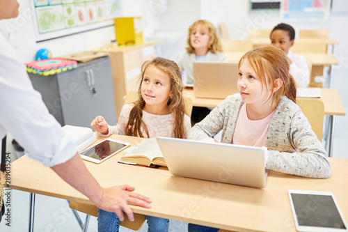 Mädchen in Schule steht vor Tafel mit Muskeln