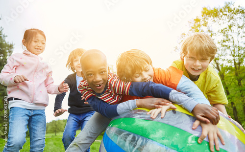 Gruppe Kinder spielt ausgelassen mit einem Ball