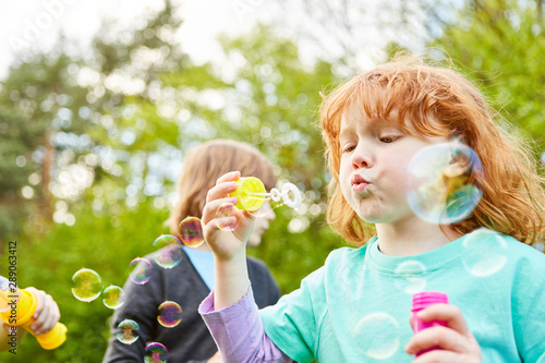 Fröhlicher Junge macht zerbrechliche Seifenblasen