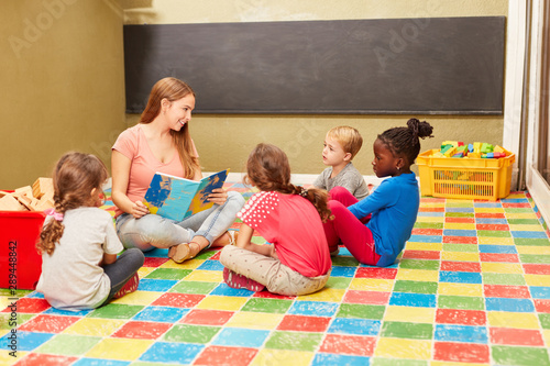 Gruppe Kinder und Lehrerin beim Vorlesen