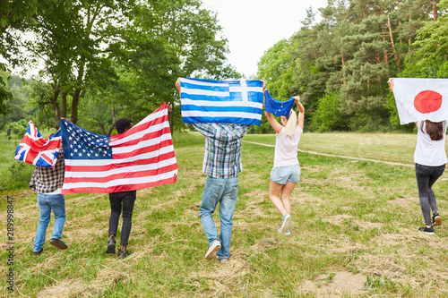 Junge Leute stehen mit verschiedenen Nationalflaggen