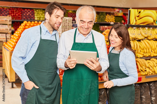 Marktleiter und Mitarbeiter nutzen Tablet Computer