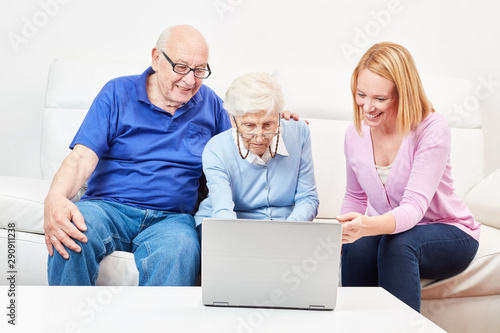 Sozialarbeiter zeigt Senioren Laptop Computer