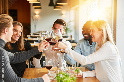 Gruppe Freunde beim Zuprosten mit Glas Wein