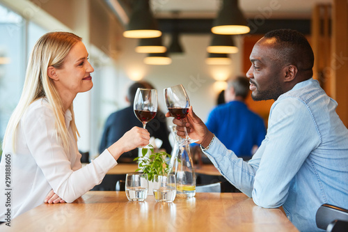 Freunde im Bistro beim Zuprosten mit Glas Wein