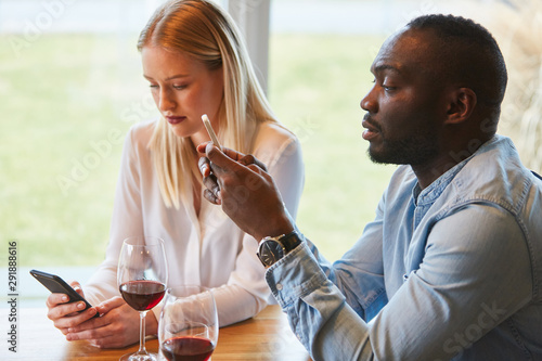 Multikulturelles Paar im Restaurant mit Smartphone