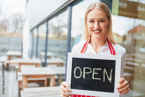 Kellnerin hängt offen Schild an Restaurant