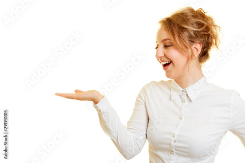 Junge Frau vergleicht Produkt Mockup auf Hand