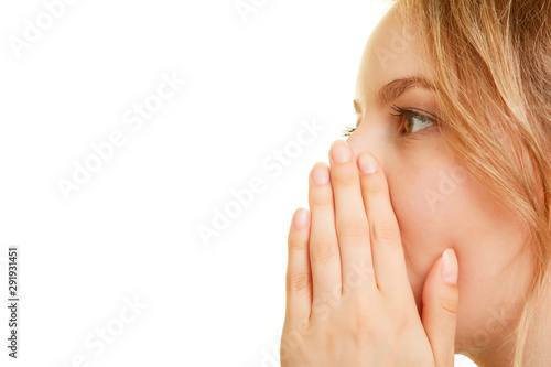Frau flüstert leise Geheimnis mit Hand am Mund