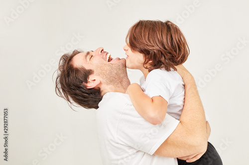 Glücklicher Vater umarmt lachend seinen Sohn