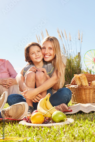 Glückliche Mutter umarmt ihren Sohn beim Picknick