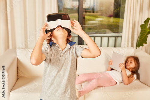 Junge schaut durch 3D Brille in der neuen Wohnung