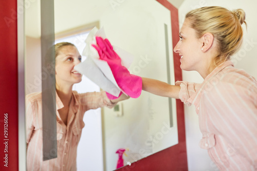 Putzfrau putzt Spiegel im Badezimmer mit Papier