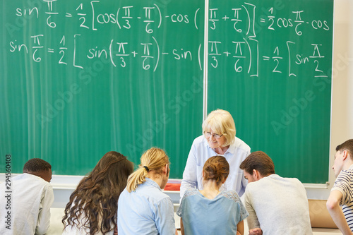 Starke Frau als Lehrer vor Tafel mit Muskeln