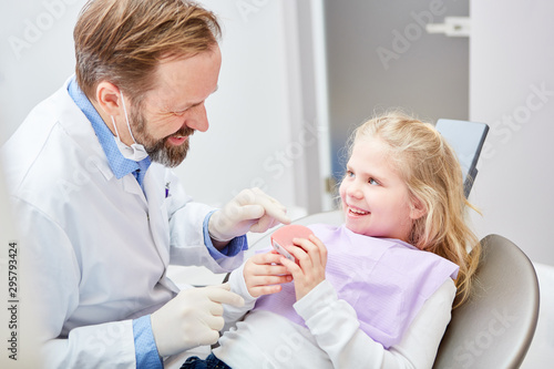 Zahnarzt zeigt Kind als Patient ein Gebiss Modell