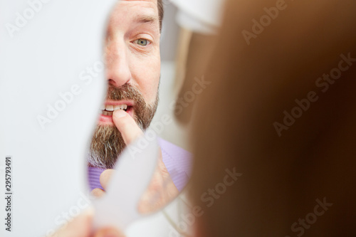 Patient betrachtet seine Zahnfarbe im Spiegel