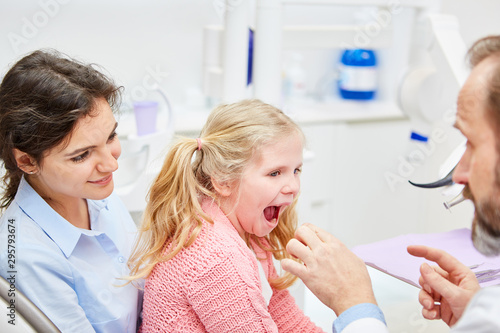 Zahnarzt erklärt Kind und Mutter Behandlung