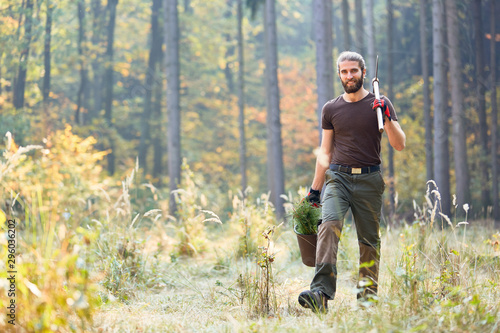 Junger Waldarbeiter pflanzt Bäume für Nachhaltigkeit
