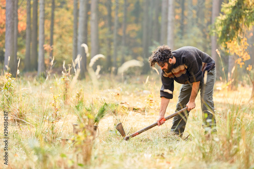 Waldarbeiter buddelt ein Pflanzloch für Setzlinge