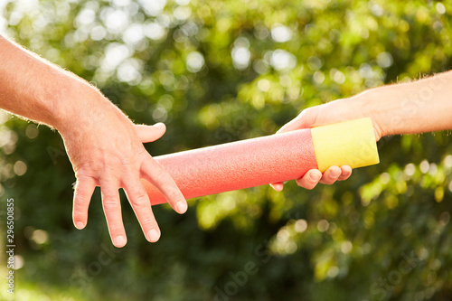 Hände geben Handschlag vor grüner Natur als Deal Konzept