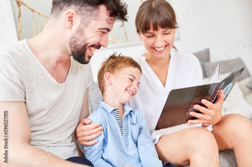 Familie schaut Fotoalbum oder Bilderbuch mit Sohn
