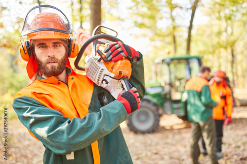 Holzfäller mit Motorsäge und Schutzkleidung im Wald