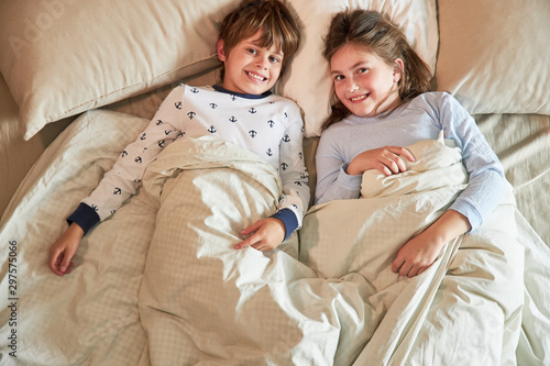 Brother and sister in bed silly happy