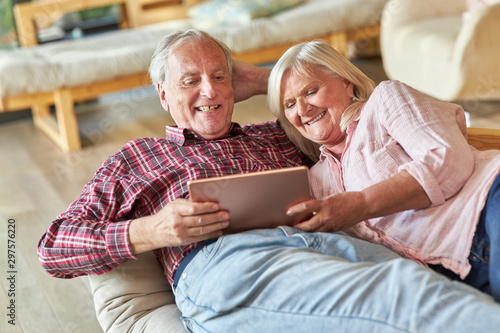 Paar Senioren hat Spaß mit dem Tablet Computer