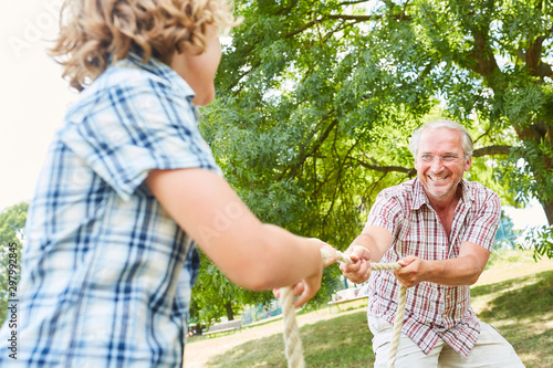 Großvater trägt seinen Enkelsohn auf dem Arm