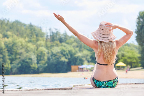 Junge Frau im Bikini beim Sonnen am Steg im Sommer