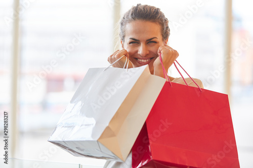 Glückliche Frau mit Kreditkarte und vielen Einkaufstüten