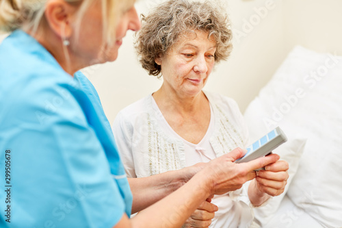 Pflegedienst hilft Seniorin mit der Fernbedienung