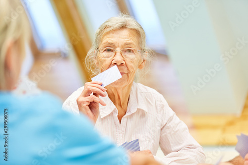 Glückliche Seniorin hat Spaß beim Kartenspiel
