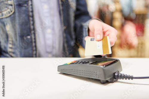 Junge Frau zahlt mit Kreditkarte an der Kasse