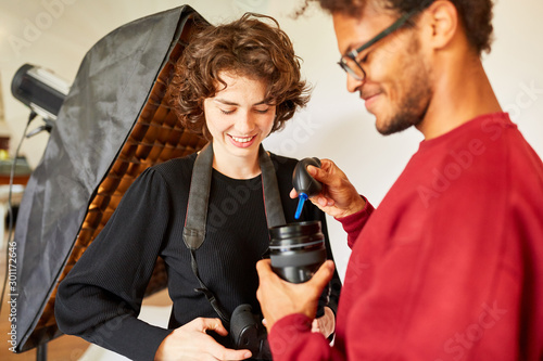 Zwei junge Fotostudenten bei der Objektivreinigung