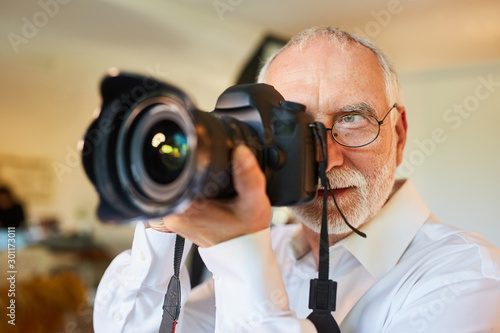 Selbständiger älterer Fotograf in seinem Fotostudio