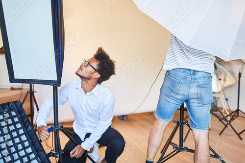 Fotograf bereitet Blitzanlage und Studioleuchte vor