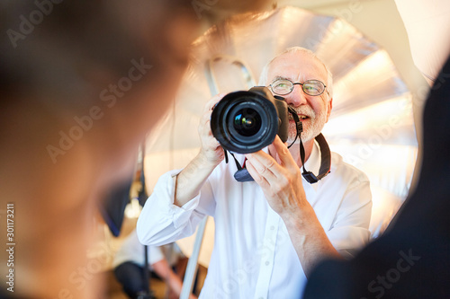 Erfahrener Fotograf mit Kamera macht Porträtfotos