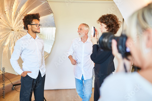 Team and model preparing photo shoot