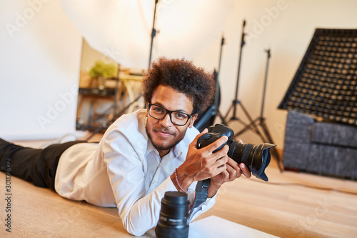 Junger Fotograf im Fotostudium prüft Kameramodus
