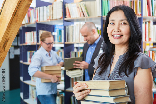 Frau in der Bibliothek sucht ein Buch zum Ausleihen